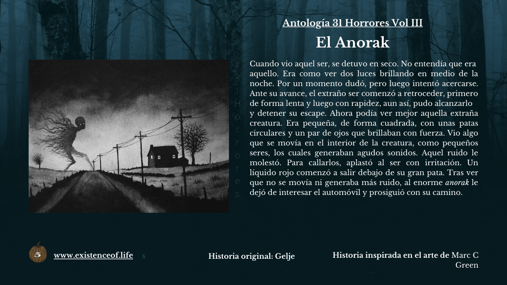 Cuando vio aquel ser, se detuvo en seco. No entendía que era aquello. Era como ver dos luces brillando en medio de la noche. Por un momento dudó, pero luego intentó acercarse. Ante su avance, el extraño ser comenzó a retroceder, primero de forma lenta y luego con rapidez, aun así, pudo alcanzarlo y detener su escape. Ahora podía ver mejor aquella extraña creatura. Era pequeña, de forma cuadrada, con unas patas circulares y un par de ojos que brillaban con fuerza. Vio algo que se movía en el interior de la creatura, como pequeños seres, los cuales generaban agudos sonidos. Aquel ruido le molestó. Para callarlos, aplastó al ser con irritación. Un líquido rojo comenzó a salir debajo de su gran pata. Tras ver que no se movía ni generaba más ruido, al enorme anorak le dejó de interesar el automóvil y prosiguió con su camino.