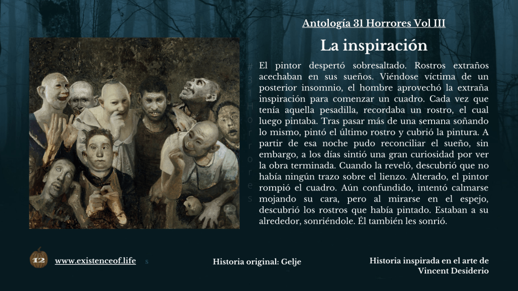 El pintor despertó sobresaltado. Rostros extraños acechaban en sus sueños. Viéndose víctima de un posterior insomnio, el hombre aprovechó la extraña inspiración para comenzar un cuadro. Cada vez que tenía aquella pesadilla, recordaba un rostro, el cual luego pintaba. Tras pasar más de una semana soñando lo mismo, pintó el último rostro y cubrió la pintura. A partir de esa noche pudo reconciliar el sueño, sin embargo, a los días sintió una gran curiosidad por ver la obra terminada. Cuando la reveló, descubrió que no había ningún trazo sobre el lienzo. Alterado, el pintor rompió el cuadro. Aún confundido, intentó calmarse mojando su cara, pero al mirarse en el espejo, descubrió los rostros que había pintado. Estaban a su alrededor, sonriéndole. Él también les sonrió.