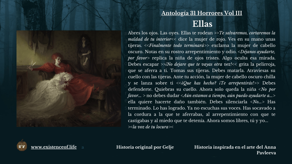 Abres los ojos. Las oyes. Ellas te rodean >>Te salvaremos, cortaremos la maldad de tu interior<< dice la mujer de rojo. Ves en su mano unas tijeras. <<Finalmente todo terminará>> exclama la mujer de cabello oscuro. Notas en su rostro arrepentimiento y odio. <Déjanos ayudarte, por favor> replica la niña de ojos tristes. Algo oculta esa mirada. Debes escapar >>¡No dejare que te vayas otra vez!<< grita la pelirroja, que se aferra a ti. Tomas sus tijeras. Debes matarla. Atraviesas su cuello con las tijeras. Ante tu acción, la mujer de cabello oscuro chilla y se lanza sobre ti <<¿Que has hecho? ¡Te arrepentirás!>> Debes defenderte. Quiebras su cuello. Ahora solo queda la niña <No por favor… > no debes dudar <Aún estamos a tiempo, aún puedo ayudarte a…> ella quiere hacerte daño también. Debes silenciarla <No…> Has terminado. Lo has logrado. Ya no escuchas sus voces. Has socavado a la cordura a la que te aferrabas, al arrepentimiento con que te castigabas y al miedo que te detenía. Ahora somos libres, tú y yo… >la voz de tu locura<