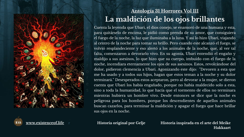 Cuenta la leyenda que Ubari, el dios conejo, se enamoró de una humana y esta, para quitárselo de encima, le pidió como prenda de su amor, que consiguiera el fuego de la noche, la luz que iluminaba a la luna. Y así lo hizo Ubari, viajando al centro de la noche para tomar su brillo. Pero cuando este alcanzó el fuego, se volvió resplandeciente y eso alertó a los animales de la noche, que, al ver tal falta, comenzaron a devorarlo vivo. En su agonía, Ubari entendió el engaño y maldijo a sus asesinos, lo que hizo que su cuerpo, imbuido con el fuego de la noche, incendiara eternamente los ojos de sus asesinos. Estos, revolcándose del dolor, pidieron clemencia a Ubari. Agonizando este dijo: «Devoren a esta que me ha usado y a todos sus hijos, hagan que estos teman a la noche y su dolor terminará.» Desesperados estos aceptaron, pero al devorar a la mujer, se dieron cuenta que Ubari los había engañado, porque no había maldecido solo a esta, sino a toda la humanidad, lo que hacía que el tormento de ellos no terminara mientras hubiera un hombre vivo. Desde entonces se dice que la noche es peligrosa para los hombres, porque los descendientes de aquellos animales buscan cazarlos, para terminar la maldición y apagar el fuego que hace brillar sus ojos en la noche.