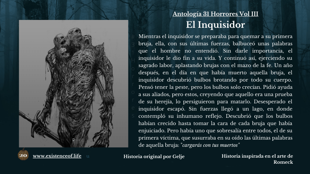 Mientras el inquisidor se preparaba para quemar a su primera bruja, ella, con sus últimas fuerzas, balbuceó unas palabras que el hombre no entendió. Sin darle importancia, el inquisidor le dio fin a su vida. Y continuó así, ejerciendo su sagrado labor, aplastando brujas con el mazo de la fe. Un año después, en el día en que había muerto aquella bruja, el inquisidor descubrió bulbos brotando por todo su cuerpo. Pensó tener la peste, pero los bulbos solo crecían. Pidió ayuda a sus aliados, pero estos, creyendo que aquello era una prueba de su herejía, lo persiguieron para matarlo. Desesperado el inquisidor escapó. Sin fuerzas llegó a un lago, en donde contempló su inhumano reflejo. Descubrió que los bulbos habían crecido hasta tomar la cara de cada bruja que había enjuiciado. Pero había uno que sobresalía entre todos, el de su primera víctima, que susurraba en su oído las últimas palabras de aquella bruja: «cargarás con tus muertos»