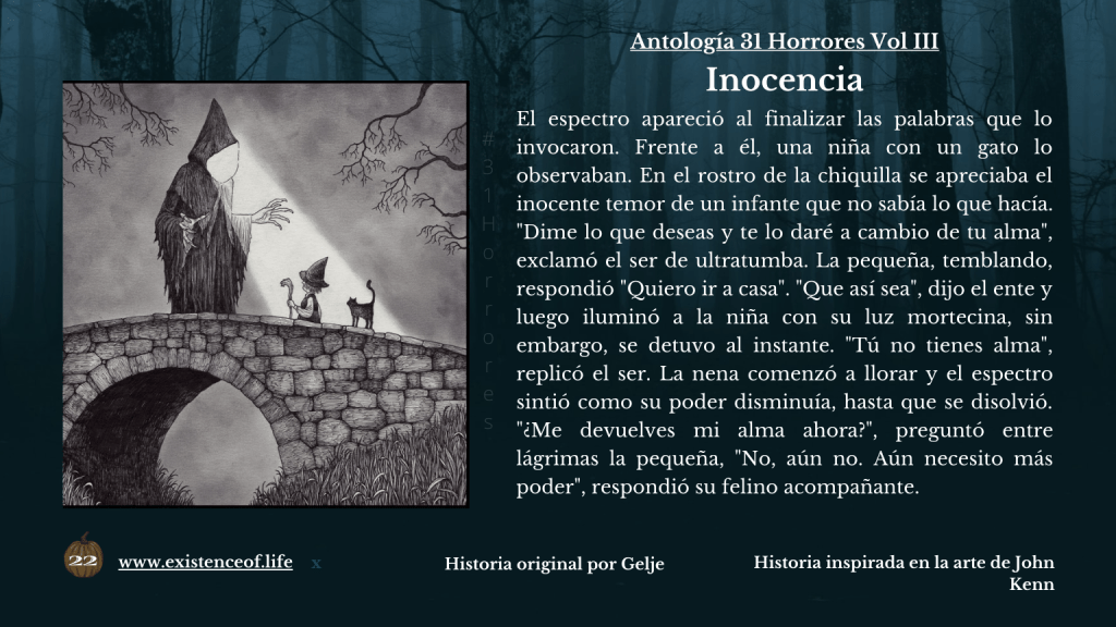 El espectro apareció al finalizar las palabras que lo invocaron. Frente a él, una niña con un gato lo observaban. En el rostro de la chiquilla se apreciaba el inocente temor de un infante que no sabía lo que hacía. «Dime lo que deseas y te lo daré a cambio de tu alma», exclamó el ser de ultratumba. La pequeña, temblando, respondió «Quiero ir a casa». «Que así sea», dijo el ente y luego iluminó a la niña con su luz mortecina, sin embargo, se detuvo al instante. «Tú no tienes alma», replicó el ser. La nena comenzó a llorar y el espectro sintió como su poder disminuía, hasta que se disolvió. «¿Me devuelves mi alma ahora?», preguntó entre lágrimas la pequeña, «No, aún no. Aún necesito más poder», respondió su felino acompañante.