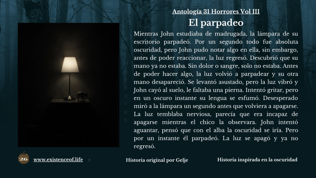 Mientras John estudiaba de madrugada, la lámpara de su escritorio parpadeó. Por un segundo todo fue absoluta oscuridad, pero John pudo notar algo en ella, sin embargo, antes de poder reaccionar, la luz regresó. Descubrió que su mano ya no estaba. Sin dolor o sangre, solo no estaba. Antes de poder hacer algo, la luz volvió a parpadear y su otra mano desapareció. Se levantó asustado, pero la luz vibró y John cayó al suelo, le faltaba una pierna. Intentó gritar, pero en un oscuro instante su lengua se esfumó. Desesperado miró a la lámpara un segundo antes que volviera a apagarse. La luz temblaba nerviosa, parecía que era incapaz de apagarse mientras el chico la observara. John intentó aguantar, pensó que con el alba la oscuridad se iría. Pero por un instante él parpadeó. La luz se apagó y ya no regresó.