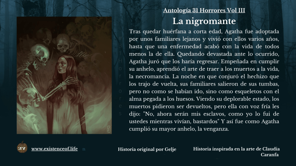 Tras quedar huérfana a corta edad, Agatha fue adoptada por unos familiares lejanos y vivió con ellos varios años, hasta que una enfermedad acabó con la vida de todos menos la de ella. Quedando devastada ante lo ocurrido, Agatha juró que los haría regresar. Empeñada en cumplir su anhelo, aprendió el arte de traer a los muertos a la vida, la necromancia. La noche en que conjuró el hechizo que los trajo de vuelta, sus familiares salieron de sus tumbas, pero no como se habían ido, sino como esqueletos con el alma pegada a los huesos. Viendo su deplorable estado, los muertos pidieron ser devueltos, pero ella con voz fría les dijo: «No, ahora serán mis esclavos, como yo lo fui de ustedes mientras vivían, bastardos» Y así fue como Agatha cumplió su mayor anhelo, la venganza.