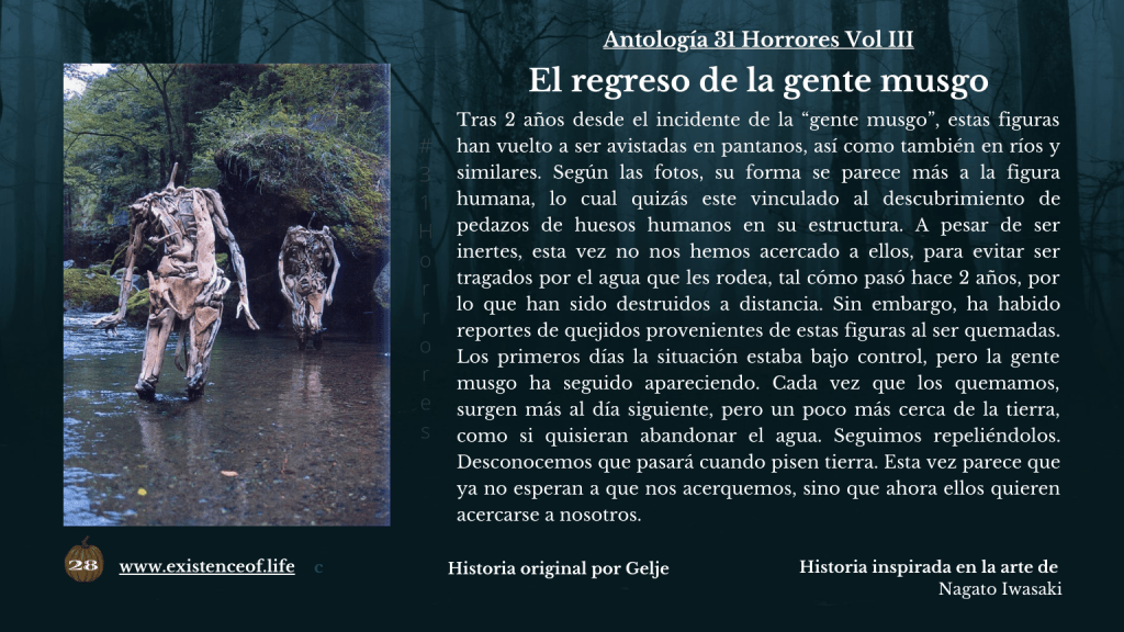 Tras 2 años desde el incidente de la “gente musgo”, estas figuras han vuelto a ser avistadas en pantanos, así como también en ríos y similares. Según las fotos, su forma se parece más a la figura humana, lo cual quizás este vinculado al descubrimiento de pedazos de huesos humanos en su estructura. A pesar de ser inertes, esta vez no nos hemos acercado a ellos, para evitar ser tragados por el agua que les rodea, tal cómo pasó hace 2 años, por lo que han sido destruidos a distancia. Sin embargo, ha habido reportes de quejidos provenientes de estas figuras al ser quemadas. Los primeros días la situación estaba bajo control, pero la gente musgo ha seguido apareciendo. Cada vez que los quemamos, surgen más al día siguiente, pero un poco más cerca de la tierra, como si quisieran abandonar el agua. Seguimos repeliéndolos. Desconocemos que pasará cuando pisen tierra. Esta vez parece que ya no esperan a que nos acerquemos, sino que ahora ellos quieren acercarse a nosotros.