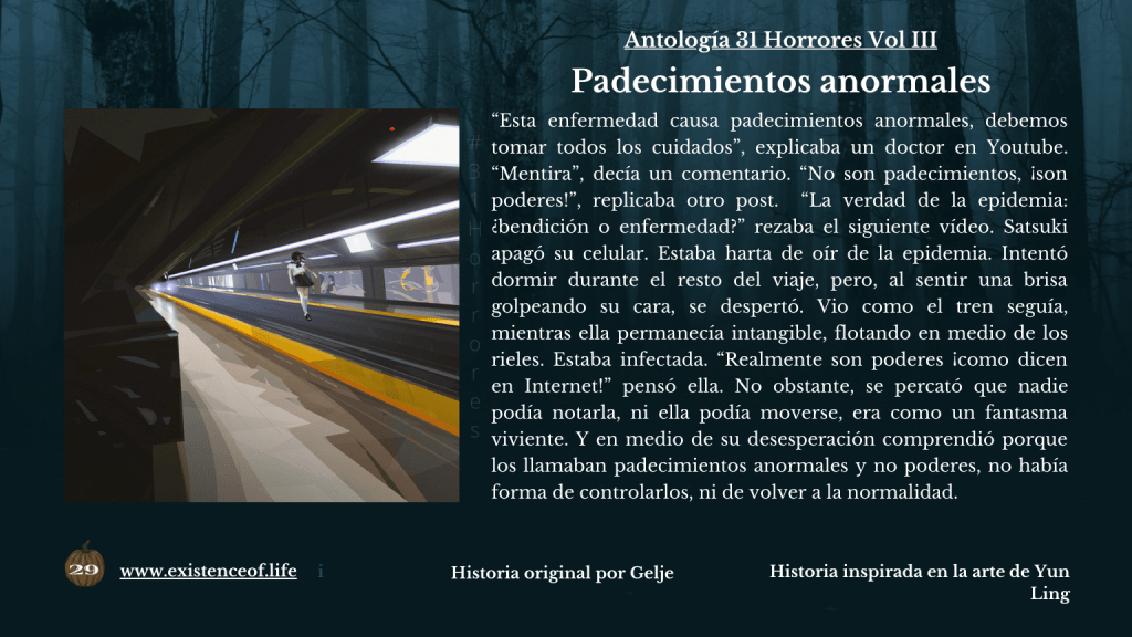 “Esta enfermedad causa padecimientos anormales, debemos tomar todos los cuidados”, explicaba un doctor en Youtube. “Mentira”, decía un comentario. “No son padecimientos, ¡son poderes!”, replicaba otro post. “La verdad de la epidemia: ¿bendición o enfermedad?” rezaba el siguiente vídeo. Satsuki apagó su celular. Estaba harta de oír de la epidemia. Intentó dormir durante el resto del viaje, pero, al sentir una brisa golpeando su cara, se despertó. Vio como el tren seguía, mientras ella permanecía intangible, flotando en medio de los rieles. Estaba infectada. “Realmente son poderes ¡como dicen en Internet!” pensó ella. No obstante, se percató que nadie podía notarla, ni ella podía moverse, era como un fantasma viviente. Y en medio de su desesperación comprendió porque los llamaban padecimientos anormales y no poderes, no había forma de controlarlos, ni de volver a la normalidad.