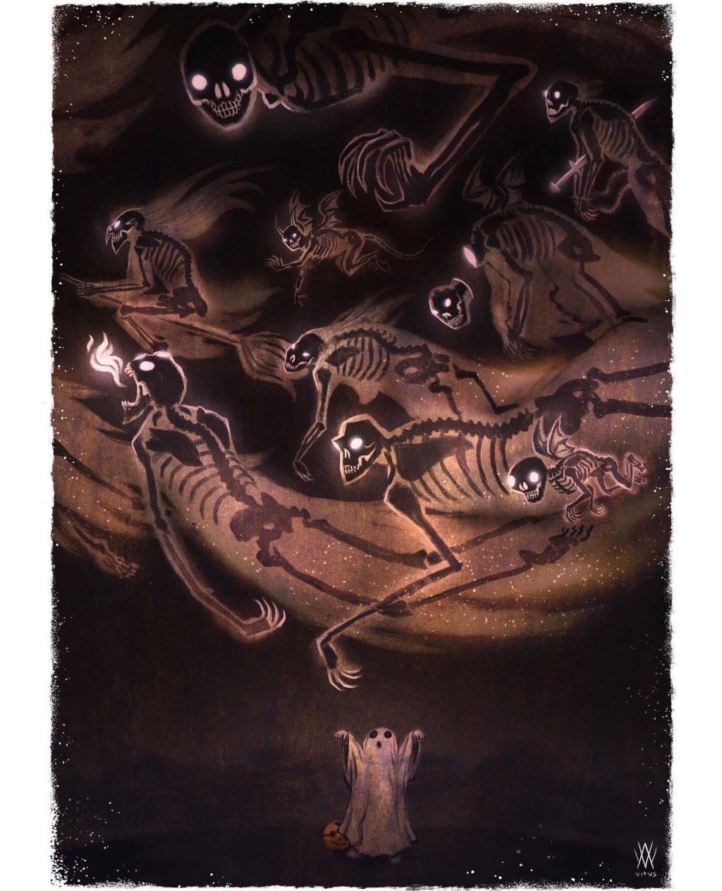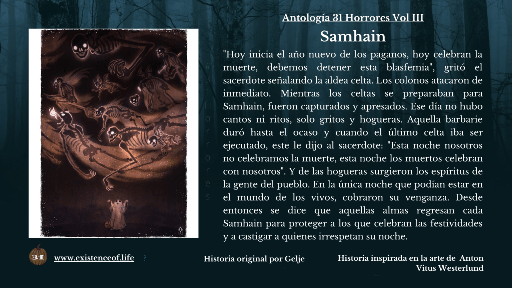«Hoy inicia el año nuevo de los paganos, hoy celebran la muerte, debemos detener esta blasfemia», gritó el sacerdote señalando la aldea celta. Los colonos atacaron de inmediato. Mientras los celtas se preparaban para Samhain, fueron capturados y apresados. Ese día no hubo cantos ni ritos, solo gritos y hogueras. Aquella barbarie duró hasta el ocaso y cuando el último celta iba ser ejecutado, este le dijo al sacerdote: «Esta noche nosotros no celebramos la muerte, esta noche los muertos celebran con nosotros». Y de las hogueras surgieron los espíritus de la gente del pueblo. En la única noche que podían estar en el mundo de los vivos, cobraron su venganza. Desde entonces se dice que aquellas almas regresan cada Samhain para proteger a los que celebran las festividades y a castigar a quienes irrespetan su noche.