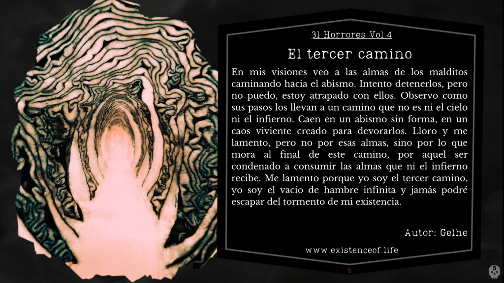 En mis visiones veo a las almas de los malditos caminando hacia el abismo. Intento detenerlos, pero no puedo, estoy atrapado con ellos. Observo como sus pasos los llevan a un camino que no es ni el cielo ni el infierno. Caen en un abismo sin forma, en un caos viviente creado para devorarlos. Lloro y me lamento, pero no por esas almas, sino por lo que mora al final de este camino, por aquel ser condenado a consumir las almas que ni el infierno recoge. Me lamento porque yo soy el tercer camino, yo soy el vacío de hambre infinita y jamás podré escapar del tormento de mi existencia.