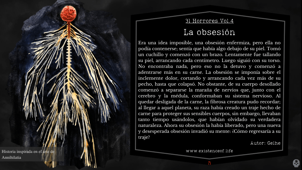 Era una idea imposible, una obsesión enfermiza, pero ella no podía contenerse; sentía que había algo debajo de su piel. Tomó un cuchillo y comenzó con un brazo. Lentamente fue tallando su piel, arrancando cada centímetro. Luego siguió con su torso. No encontraba nada, pero eso no la detuvo y comenzó a adentrarse más en su carne. La obsesión se imponía sobre el inclemente dolor, cortando y arrancando cada vez más de su pecho, hasta que colapsó. No obstante, de su cuerpo desollado comenzó a separarse la maraña de nervios que, junto con el cerebro y la médula, conformaban su sistema nervioso. Al quedar desligada de la carne, la fibrosa creatura pudo recordar; al llegar a aquel planeta, su raza había creado un traje hecho de carne para proteger sus sensibles cuerpos, sin embargo, llevaban tanto tiempo usándolos, que habían olvidado su verdadera naturaleza. Ahora su obsesión la había liberado, pero una nueva y desesperada obsesión invadió su mente: ¿Cómo regresaría a su traje?