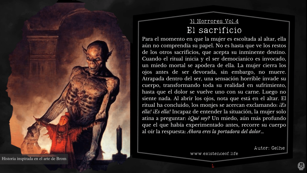 Para el momento en que la mujer es escoltada al altar, ella aún no comprendía su papel. No es hasta que ve los restos de los otros sacrificios, que acepta su inminente destino. Cuando el ritual inicia y el ser «democianico» es invocado, un miedo mortal se apodera de ella. La mujer cierra los ojos antes de ser devorada, sin embargo, no muere. Atrapada dentro del ser, una sensación horrible invade su cuerpo, transformando toda su realidad en sufrimiento, hasta que el dolor se vuelve uno con su carne. Luego no siente nada. Al abrir los ojos, nota que está en el altar. El ritual ha concluido, los monjes se acercan exclamando: ¡Es ella! ¡Es ella! Incapaz de entender la situación, la mujer solo atina a preguntar: ¿Qué soy? Un miedo, aún más profundo que el que había experimentado antes, recorre su cuerpo al oír la respuesta: Ahora eres la portadora del dolor…