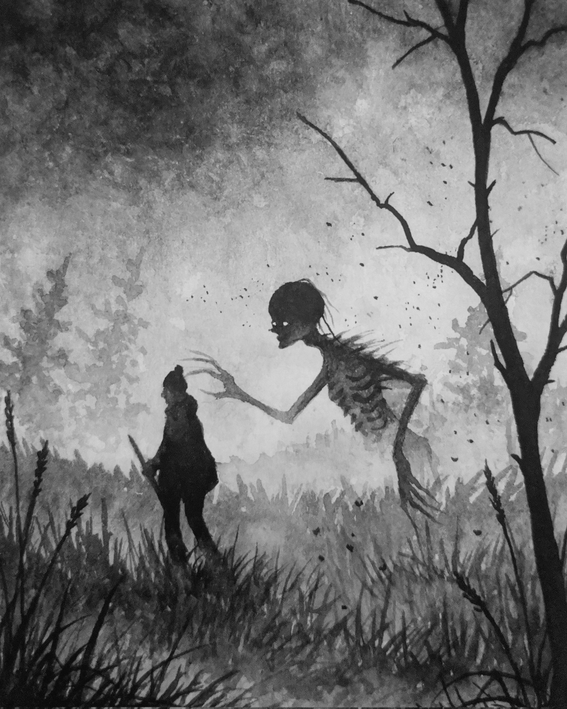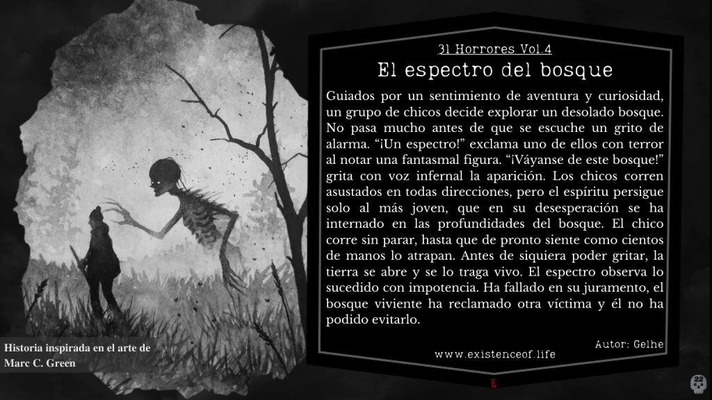 Guiados por un sentimiento de aventura y curiosidad, un grupo de chicos decide explorar un desolado bosque. No pasa mucho antes de que se escuche un grito de alarma. “¡Un espectro!” exclama uno de ellos con terror al notar una fantasmal figura. “¡Váyanse de este bosque!” grita con voz infernal la aparición. Los chicos corren asustados en todas direcciones, pero el espíritu persigue solo al más joven, que en su desesperación se ha internado en las profundidades del bosque. El chico corre sin parar, hasta que de pronto siente como cientos de manos lo atrapan. Antes de siquiera poder gritar, la tierra se abre y se lo traga vivo. El espectro observa lo sucedido con impotencia. Ha fallado en su juramento, el bosque viviente ha reclamado otra víctima y él no ha podido evitarlo.