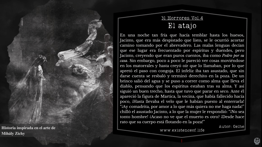 En una noche tan fría que hacía temblar hasta los huesos, Jacinto, que era más despistado que listo, se le ocurrió acortar camino tomando por el abrevadero. Las malas lenguas decían que ese lugar era frecuentado por espíritus y duendes, pero Jacinto, creyendo que eran puros cuentos, iba como Pedro por su casa. Sin embargo, poco a poco le pareció ver cosas moviéndose en los matorrales y hasta creyó oír que lo llamaban, por lo que apretó el paso con congoja. El infeliz iba tan asustado, que sin darse cuenta se resbaló y terminó derechito en la poza. De un brinco salió del agua y se puso a correr como alma que lleva el diablo, pensando que los espíritus estaban tras su alma. Y así siguió un buen trecho, hasta que tuvo que parar en seco. Ante él apareció la figura de Martica, la vecina, que había fallecido hacía poco, ¡Hasta llevaba el velo que le habían puesto al enterrarla! “¡Ay comadrita, por amor a lo que más quiera no me haga nada!” chilló el asustado Jacinto, a lo que la mujer le respondió: “¡No sea tonto hombre! ¿Acaso no ve que el muerto es otro? ¡Desde hace rato que su cuerpo está flotando en la poza!”