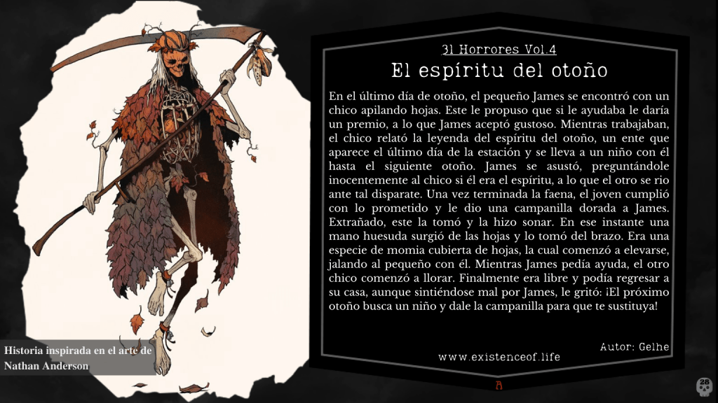 En el último día de otoño, el pequeño James se encontró con un chico apilando hojas. Este le propuso que si le ayudaba le daría un premio, a lo que James aceptó gustoso. Mientras trabajaban, el chico relató la leyenda del espíritu del otoño, un ente que aparece el último día de la estación y se lleva a un niño con él hasta el siguiente otoño. James se asustó, preguntándole inocentemente al chico si él era el espíritu, a lo que el otro se rio ante tal disparate. Una vez terminada la faena, el joven cumplió con lo prometido y le dio una campanilla dorada a James. Extrañado, este la tomó y la hizo sonar. En ese instante una mano huesuda surgió de las hojas y lo tomó del brazo. Era una especie de momia cubierta de hojas, la cual comenzó a elevarse, jalando al pequeño con él. Mientras James pedía ayuda, el otro chico comenzó a llorar. Finalmente era libre y podía regresar a su casa, aunque sintiéndose mal por James, le gritó: ¡El próximo otoño busca un niño y dale la campanilla para que te sustituya!