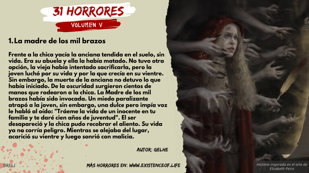 Frente a la chica yacía la anciana tendida en el suelo, sin vida. Era su abuela y ella la había matado. No tuvo otra opción, la vieja había intentado sacrificarla, pero la joven luchó por su vida y por la que crecía en su vientre. Sin embargo, la muerte de la anciana no detuvo lo que había iniciado. De la oscuridad surgieron cientos de manos que rodearon a la chica. La Madre de los mil brazos había sido invocada. Un miedo paralizante atrapó a la joven, sin embargo, una dulce pero impía voz le habló al oído: «Tráeme la vida de un inocente en tu familia y te daré cien años de juventud». El ser desapareció y la chica pudo recobrar el aliento. Su vida ya no corría peligro. Mientras se alejaba del lugar, acarició su vientre y luego sonrió con malicia.