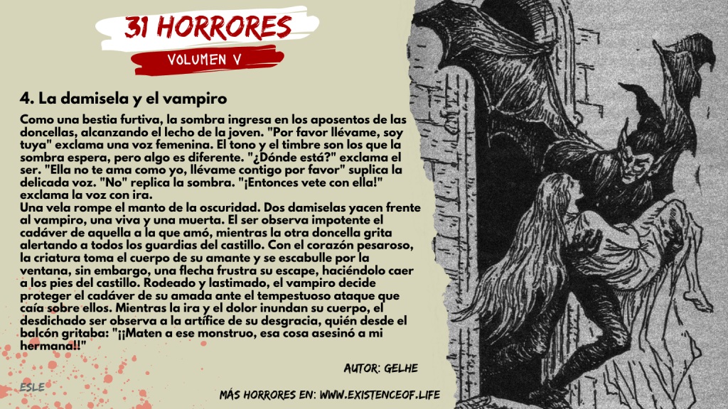 Como una bestia furtiva, la sombra ingresa en los aposentos de las doncellas, alcanzando el lecho de la joven. «Por favor llévame, soy tuya» exclama una voz femenina. El tono y el timbre son los que la sombra espera, pero algo es diferente. «¿Dónde está?» exclama el ser. «Ella no te ama como yo, llévame contigo por favor» suplica la delicada voz. «No» replica la sombra. «¡Entonces vete con ella!» exclama la voz con ira. Una vela rompe el manto de la oscuridad. Dos damiselas yacen frente al vampiro, una viva y una muerta. El ser observa impotente el cadáver de aquella a la que amó, mientras la otra doncella grita alertando a todos los guardias del castillo. Con el corazón pesaroso, la criatura toma el cuerpo de su amante y se escabulle por la ventana, sin embargo, una flecha frustra su escape, haciéndolo caer a los pies del castillo. Rodeado y lastimado, el vampiro decide proteger el cadáver de su amada ante el tempestuoso ataque que caía sobre ellos. Mientras la ira y el dolor inundan su cuerpo, el desdichado ser observa a la artífice de su desgracia, quién desde el balcón gritaba: «¡¡Maten a ese monstruo, esa cosa asesinó a mi hermana!!»
