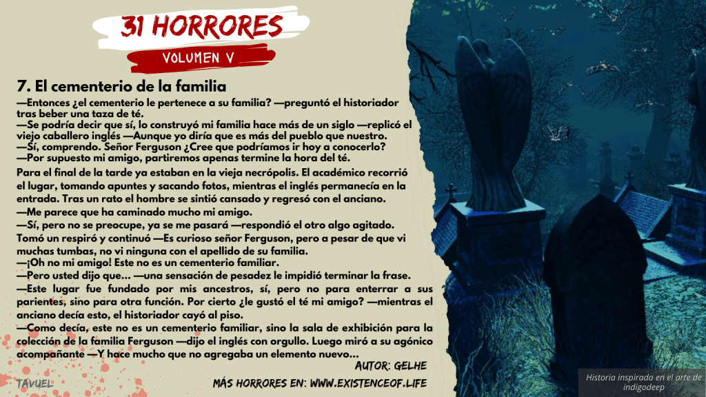 —Como decía, este no es un cementerio familiar, sino la sala de exhibición para la colección de la familia Ferguson —dijo el inglés con orgullo. Luego miró a su agónico acompañante —Y hace mucho que no agregaba un elemento nuevo…