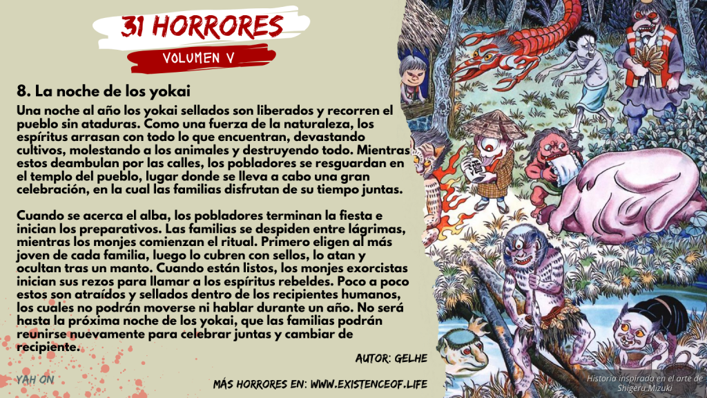 Cuando se acerca el alba, los pobladores terminan la fiesta e inician los preparativos. Las familias se despiden entre lágrimas, mientras los monjes comienzan el ritual. Primero eligen al más joven de cada familia, luego lo cubren con sellos, lo atan y ocultan tras un manto. Cuando están listos, los monjes exorcistas inician sus rezos para llamar a los espíritus rebeldes. Poco a poco estos son atraídos y sellados dentro de los recipientes humanos, los cuales no podrán moverse ni hablar durante un año. No será hasta la próxima noche de los yokai, que las familias podrán reunirse nuevamente para celebrar juntas y cambiar de recipiente.