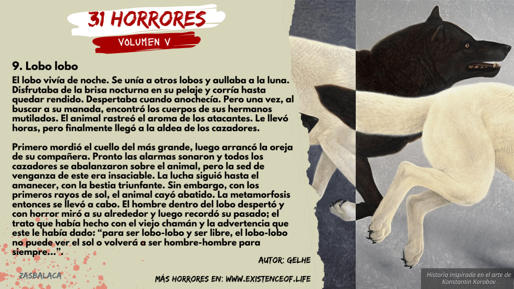 El lobo vivía de noche. Se unía a otros lobos y aullaba a la luna. Disfrutaba de la brisa nocturna en su pelaje y corría hasta quedar rendido. Despertaba cuando anochecía. Pero una vez, al buscar a su manada, encontró los cuerpos de sus hermanos mutilados. El animal rastreó el aroma de los atacantes. Le llevó horas, pero finalmente llegó a la aldea de los cazadores.