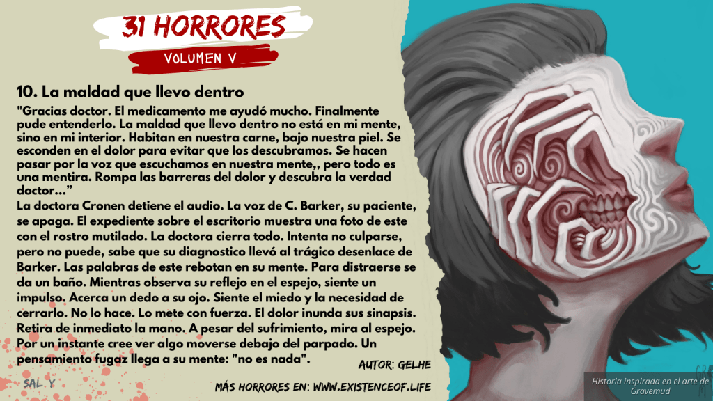 «Gracias doctor. El medicamento me ayudó mucho. Finalmente pude entenderlo. La maldad que llevo dentro no está en mi mente, sino en mi interior. Habitan en nuestra carne, bajo nuestra piel. Se esconden en el dolor para evitar que los descubramos. Se hacen pasar por la voz que escuchamos en nuestra mente,, pero todo es una mentira. Rompa las barreras del dolor y descubra la verdad doctor…”