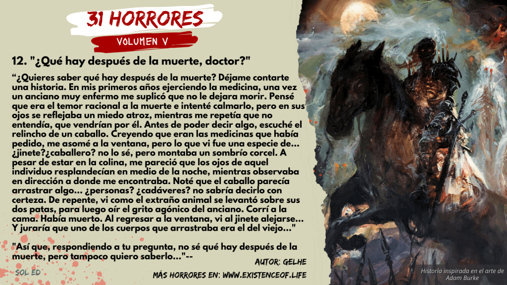 “¿Quieres saber qué hay después de la muerte? Déjame contarte una historia. En mis primeros años ejerciendo la medicina, una vez un anciano muy enfermo me suplicó que no le dejara morir. Pensé que era el temor racional a la muerte e intenté calmarlo, pero en sus ojos se reflejaba un miedo atroz, mientras me repetía que no entendía, que vendrían por él. Antes de poder decir algo, escuché el relincho de un caballo. Creyendo que eran las medicinas que había pedido, me asomé a la ventana, pero lo que vi fue una especie de… ¿jinete?¿caballero? no lo sé, pero montaba un sombrío corcel. A pesar de estar en la colina, me pareció que los ojos de aquel individuo resplandecían en medio de la noche, mientras observaba en dirección a donde me encontraba. Noté que el caballo parecía arrastrar algo… ¿personas? ¿cadáveres? no sabría decirlo con certeza. De repente, vi como el extraño animal se levantó sobre sus dos patas, para luego oír el grito agónico del anciano. Corrí a la cama. Había muerto. Al regresar a la ventana, vi al jinete alejarse…