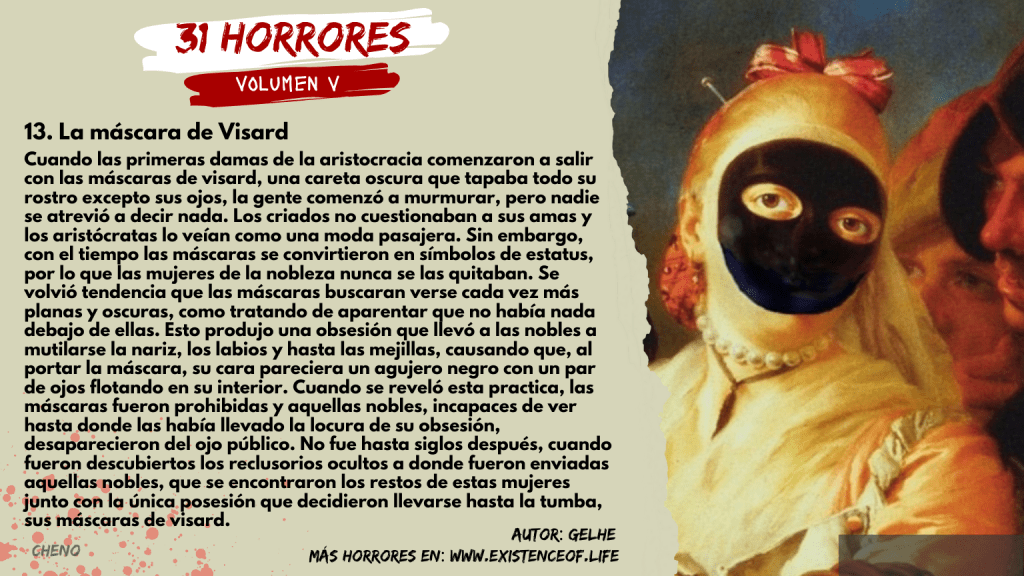 Cuando las primeras damas de la aristocracia comenzaron a salir con las máscaras de visard, una careta oscura que tapaba todo su rostro excepto sus ojos, la gente comenzó a murmurar, pero nadie se atrevió a decir nada. Los criados no cuestionaban a sus amas y los aristócratas lo veían como una moda pasajera. Sin embargo, con el tiempo las máscaras se convirtieron en símbolos de estatus, por lo que las mujeres de la nobleza nunca se las quitaban. Se volvió tendencia que las máscaras buscaran verse cada vez más planas y oscuras, como tratando de aparentar que no había nada debajo de ellas. Esto produjo una obsesión que llevó a las nobles a mutilarse la nariz, los labios y hasta las mejillas, causando que, al portar la máscara, su cara pareciera un agujero negro con un par de ojos flotando en su interior. Cuando se reveló esta practica, las máscaras fueron prohibidas y aquellas nobles, incapaces de ver hasta donde las había llevado la locura de su obsesión, desaparecieron del ojo público. No fue hasta siglos después, cuando fueron descubiertos los reclusorios ocultos a donde fueron enviadas aquellas nobles, que se encontraron los restos de estas mujeres junto con la única posesión que decidieron llevarse hasta la tumba, sus máscaras de visard.