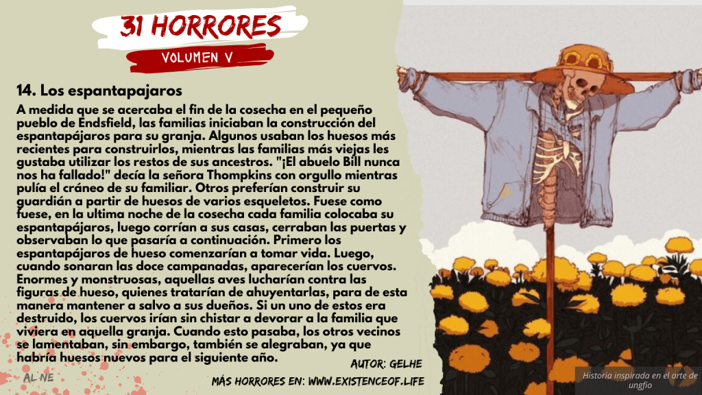 A medida que se acercaba el fin de la cosecha en el pequeño pueblo de Endsfield, las familias iniciaban la construcción del espantapájaros para su granja. Algunos usaban los huesos más recientes para construirlos, mientras las familias más viejas les gustaba utilizar los restos de sus ancestros. «¡El abuelo Bill nunca nos ha fallado!» decía la señora Thompkins con orgullo mientras pulía el cráneo de su familiar. Otros preferían construir su guardián a partir de huesos de varios esqueletos. Fuese como fuese, en la ultima noche de la cosecha cada familia colocaba su espantapájaros, luego corrían a sus casas, cerraban las puertas y observaban lo que pasaría a continuación. Primero los espantapájaros de hueso comenzarían a tomar vida. Luego, cuando sonaran las doce campanadas, aparecerían los cuervos. Enormes y monstruosas, aquellas aves lucharían contra las figuras de hueso, quienes tratarían de ahuyentarlas, para de esta manera mantener a salvo a sus dueños. Si un uno de estos era destruido, los cuervos irían sin chistar a devorar a la familia que viviera en aquella granja. Cuando esto pasaba, los otros vecinos se lamentaban, sin embargo, también se alegraban, ya que habría huesos nuevos para el siguiente año.