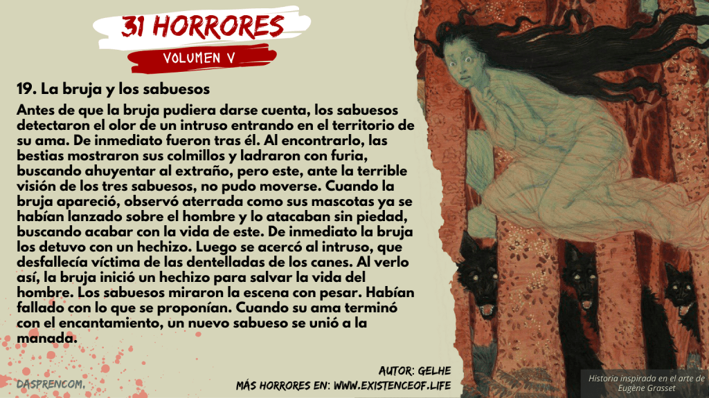 Antes de que la bruja pudiera darse cuenta, los sabuesos detectaron el olor de un intruso entrando en el territorio de su ama. De inmediato fueron tras él. Al encontrarlo, las bestias mostraron sus colmillos y ladraron con furia, buscando ahuyentar al extraño, pero este, ante la terrible visión de los tres sabuesos, no pudo moverse. Cuando la bruja apareció, observó aterrada como sus mascotas ya se habían lanzado sobre el hombre y lo atacaban sin piedad, buscando acabar con la vida de este. De inmediato la bruja los detuvo con un hechizo. Luego se acercó al intruso, que desfallecía víctima de las dentelladas de los canes. Al verlo así, la bruja inició un hechizo para salvar la vida del hombre. Los sabuesos miraron la escena con pesar. Habían fallado con lo que se proponían. Cuando su ama terminó con el encantamiento, un nuevo sabueso se unió a la manada.