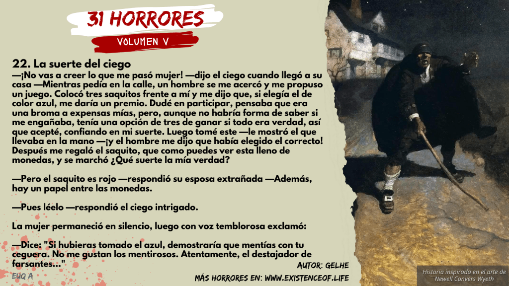 —¡No vas a creer lo que me pasó mujer! —dijo el ciego cuando llegó a su casa —Mientras pedía en la calle, un hombre se me acercó y me propuso un juego. Colocó tres saquitos frente a mí y me dijo que, si elegía el de color azul, me daría un premio. Dudé en participar, pensaba que era una broma a expensas mías, pero, aunque no habría forma de saber si me engañaba, tenía una opción de tres de ganar si todo era verdad, así que acepté, confiando en mi suerte. Luego tomé este —le mostró el que llevaba en la mano —¡y el hombre me dijo que había elegido el correcto! Después me regaló el saquito, que como puedes ver esta lleno de monedas, y se marchó ¿Qué suerte la mía verdad?