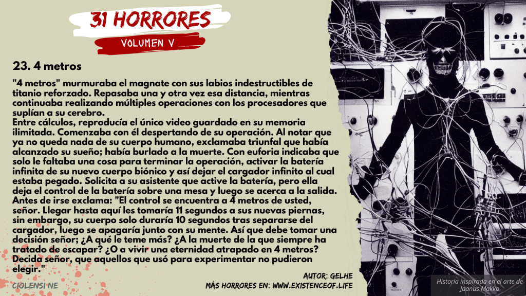 Entre cálculos, reproducía el único video guardado en su memoria ilimitada. Comenzaba con él despertando de su operación. Al notar que ya no queda nada de su cuerpo humano, exclamaba triunfal que había alcanzado su sueño; había burlado a la muerte. Con euforia indicaba que solo le faltaba una cosa para terminar la operación, activar la batería infinita de su nuevo cuerpo biónico y así dejar el cargador infinito al cual estaba pegado. Solicita a su asistente que active la batería, pero ella deja el control de la batería sobre una mesa y luego se acerca a la salida. Antes de irse exclama: «El control se encuentra a 4 metros de usted, señor. Llegar hasta aquí les tomaría 11 segundos a sus nuevas piernas, sin embargo, su cuerpo solo duraría 10 segundos tras separarse del cargador, luego se apagaría junto con su mente. Así que debe tomar una decisión señor; ¿A qué le teme más? ¿A la muerte de la que siempre ha tratado de escapar? ¿O a vivir una eternidad atrapado en 4 metros? Decida señor, que aquellos que usó para experimentar no pudieron elegir.»