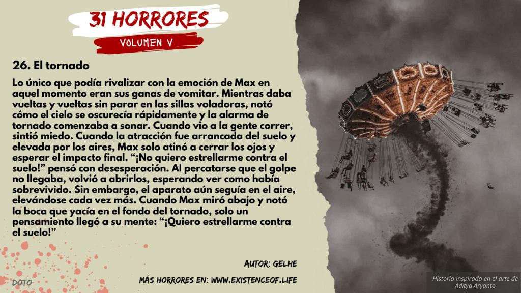 Lo único que podía rivalizar con la emoción de Max en aquel momento eran sus ganas de vomitar. Mientras daba vueltas y vueltas sin parar en las sillas voladoras, notó cómo el cielo se oscurecía rápidamente y la alarma de tornado comenzaba a sonar. Cuando vio a la gente correr, sintió miedo. Cuando la atracción fue arrancada del suelo y elevada por los aires, Max solo atinó a cerrar los ojos y esperar el impacto final. “¡No quiero estrellarme contra el suelo!” pensó con desesperación. Al percatarse que el golpe no llegaba, volvió a abrirlos, esperando ver como había sobrevivido. Sin embargo, el aparato aún seguía en el aire, elevándose cada vez más. Cuando Max miró abajo y notó la boca que yacía en el fondo del tornado, solo un pensamiento llegó a su mente: “¡Quiero estrellarme contra el suelo!”